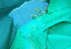 J’ai laissé de l’eau stagner sur la surface du tissu pendant 20 minutes et il n’y a pas eu d’infiltration de l’eau : on a bien une veste étanche et pas seulement un coupe-vent déperlant. D’ailleurs, les vestes MASCOT de la gamme ACCELERATE sont conforment à la norme EN 343 (protection contre la pluie), avec la meilleure classe de protection contre la pluie ainsi que la meilleure classe d’évacuation de l’humidité.